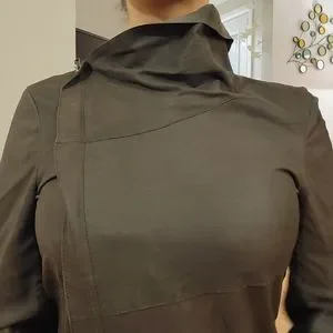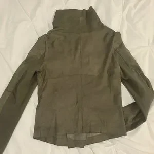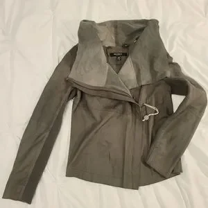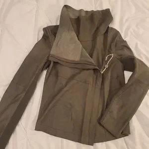 Grey leather biker jacket with a draped front D-tab fastening element at the front, features ribbed knit panels under the sleeve, double buckle straps at the sides.