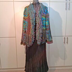 My Fairy Forrest Brown Green Turquoise Granny Square Super Fringe Sweater L/XL