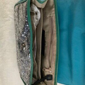 By Appointment to Her Majesty the Queen My Flat in London Evening Clutch Bag with Silver Shoulder Adjustable Chain in Green-Patent with Bow, Teal and Sparkling Sequins with Large Emerald Cut Sparkling Gem surrounded by 14 Round Rhinestones for Dress to Impress!