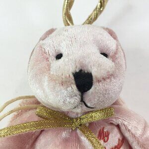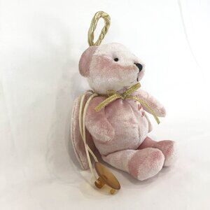 This is a soft pink bear, filled with pellets, a gold ribbon bow, a gold halo and lace wings. It has a suction cup and long string that it hangs from. It has darker pink cursive writing that reads My Guardian Angel. By Aurora it is 6 inches tall not including the halo. It is preloved and the suction cup has discoloured with age.