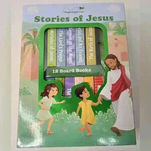 The simple stories will delight babies and toddlers. Whimsical illustrations bring the stories to life. The small sturdy board books are great for little fingers! - 3x3 inches each. The books included are: The Birth of Jesus, Baby Jesus, Miracles of Jesus, Miracle at Cana, Jesus Heals the Sick, The Parables, The Sower, The Good Samaritan, The Prodigal Son, The Lord's Prayer, The Sermon on the Mount, and Jesus and His Friends. The keepsake box neatly houses all 12 books until it's time to bring them out again!