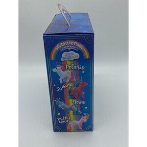 Brand new in box Celestial Pony Nova. This is probably the hardest to find version as she has pink stripes but the art work has white stripes. There are three versions. The other two have artwork that match the pony in the box. The box measures 8” long by 8” wide. Please view photos for details.