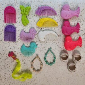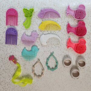 Small Lot of My Little Pony Combs, Brushes & Accessories. Including some baby necklaces and a few shoes(one has crack in it) and a hair comb from *Romper*. All are 1980's & Early 1990's. All are in good to great preloved condition, and have been cleaned, sanitized and inspected for defects, please see photo illustrations.