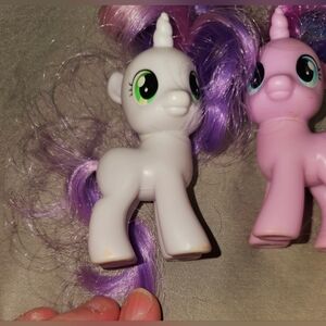 Both Ponies are not mint. Both ponies are in need of a spa. Hair does not appear cut. Baby Sweetie Belle appears to have some orange on her hooves. Star Dreams has a bite mark on her ear (possibly from my cat). She has a couple marks on her that can probably be taken off with a magic eraser or with the assistance of a YouTube video. Look over the photos carefully before purchasing. Sold as is.