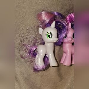 Both Ponies are not mint. Both ponies are in need of a spa. Hair does not appear cut. Baby Sweetie Belle appears to have some orange on her hooves. Star Dreams has a bite mark on her ear (possibly from my cat). She has a couple marks on her that can probably be taken off with a magic eraser or with the assistance of a YouTube video. Look over the photos carefully before purchasing. Sold as is.