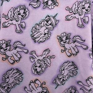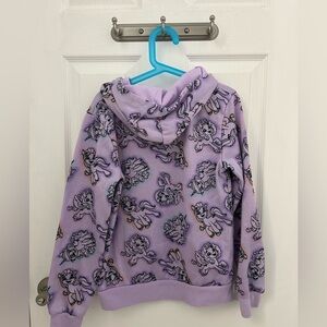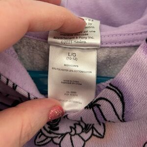 Purple sweatshirt featuring My Little Pony characters. Inside is fleecy and white. Pull over hoodie design. Great used condition. Says 10-12 size, but I think it fits smaller (8-9), so please pay attention to measurements to ensure fit. Arm pit to arm pit is 15.5” and length is 18” from collar to bottom.
