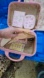 The My Melody case has a hard shell and also has a lock to keep your items safe! The canvas My Melody tote is spacious and closes securely with a zipper. I have included a couple of lip glosses, eye lash curler, bandaids, heart shaped mirror compact, cute mini earrings, a collapsible My Melody crate, a mini makeup bag and a cute little figure of Hello Kitty dressed as My Melody - too perfect!