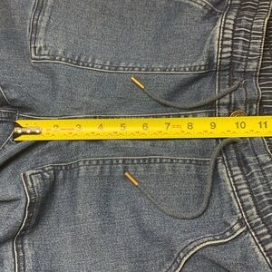 These jeans have an elastic waist and elastic at the bottom of the legs. Super comfortable for whatever your day brings.