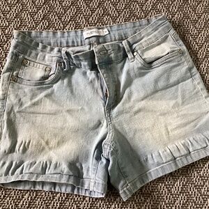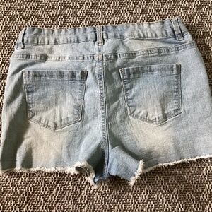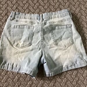 Two stretchy jean shorts, one with frayed edges, one with hemmed edge (this pair has some pulled bubbles… see pics). Also one pair of black shorts, straight hemmed edge. All have zipper and button closure. All are previously owned, good used condition.