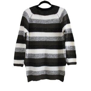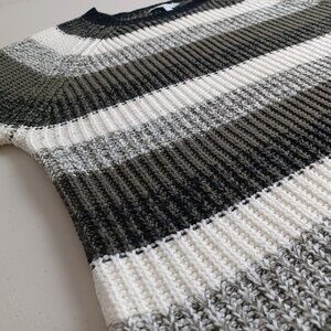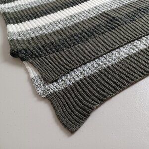 A cozy rib knit sweater in earthy tones of olive green, beige, ivory, black and grey. It’s a simple pullover style with a light stretch. The hemline dips slightly lower at the back and has a subtle split hem, giving you extra room to move comfortably. Ideal for fall and winter layering. Gently worn, very good condition.