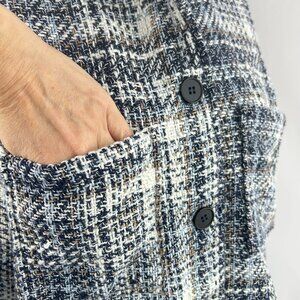 Chic preppy tweed jacket featuring a multi-tone plaid weave in navy, cream, light blue, beige, and a subtle silver thread. Designed with black button closures and two functional front pockets. Soft textured boucle-style fabric with a polished, classic look.