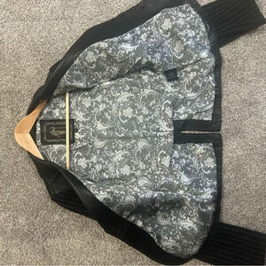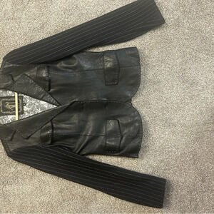 My Tribe beautiful leather jacket with cotton pinstriped sleeves in amazing condition! This is a sought after rare leather works works brand and comparables are over 200 used- this is a very unique find size M in great used.condition