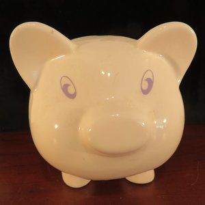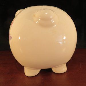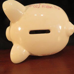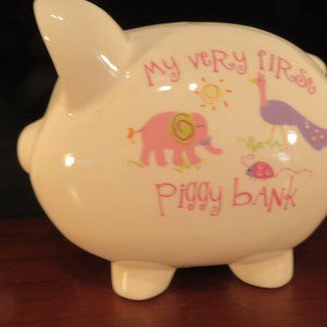 Ceramic white piggy bank, with pink letters "My Very First Piggy Bank" on both sides, and an elephant, peacock and ladybug. Made in China, no stopper underneath. Great for baby's first birthday!