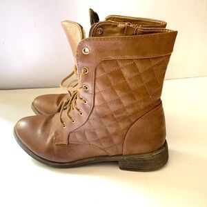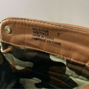Details - Brown combat style boots with camo print on the inside, side zipper and lace up, has some marks (see pictures)