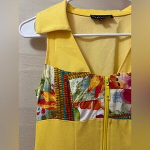 Bright yellow Myco Anna zip up sleeveless dress featuring a vibrant multicolor pattern on the bodice. Perfect for a sunny day out. There is a little spot in the back to be noted, as pictured.