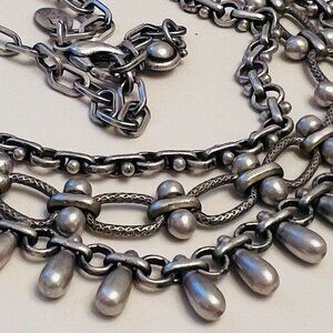Ornate triple-strand choker necklace by Myka Designs. Based in Vancouver Canada, Myka was founded in 1987 and are recognized for their sophisticated design and manufacturing process, all in Vancouver. This very special piece is meticulously crafted of lead-free pewter, with each strand of the choker completely unique, yet harmonious with the others. Necklace fastens with a secure lobster clasp. The design echoes ancient Celtic, Druidic or Roman aesthetic with a modern vibe. This necklace is superpretty 💗 and fun to wear. The total length is a generous 17", and the chain can be adjusted to size if you want to wear it snugly against your neck as a choker. The lustre of the pewter is flattering and striking.