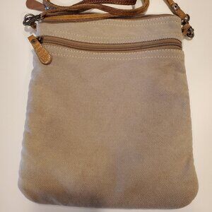 I have a beautiful cross-body Myra Bag up for grabs in good used condition! Intentional upcycled/weathered look with three deep zipper pockets (all three go down to the depth of the bottom of the bag). Bag dimensions are approx. 11 x 9 inches. Outer shell is noted as 100% cotton carve and 100% leather. Inner shell is noted as 100% cotton.
