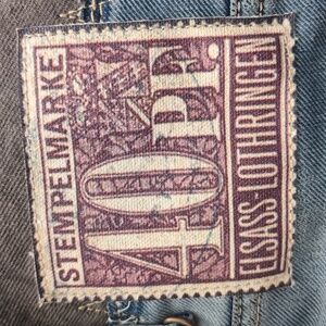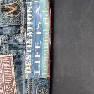 Myra bag, denim collection small zippered wristlet, features sewn patches and a leather strap.