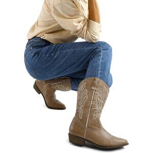 🆕Mysoft Cowboy Heel Boots Women Light Brown PU Embroidered Mid-Calf Pointed Toe