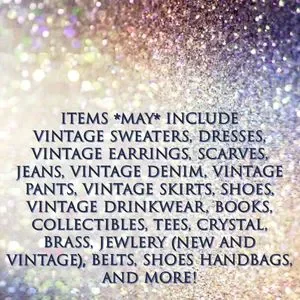 ITEMS COULD INCLUDE VINTAGE SWEATERS, DRESSES, VINTAGE EARRINGS, SCARVES, JEANS, VINTAGE DENIM, VINTAGE PANTS, VINTAGE SKIRTS, SHOES, VINTAGE DRINKWEAR, BOOKS, COLLECTIBLES, TEES, CRYSTAL, BRASS, JEWLERY (NEW AND VINTAGE), BELTS, SHOES HANDBAGS, AND MORE!