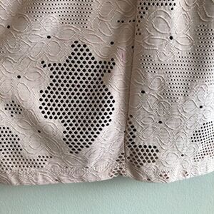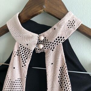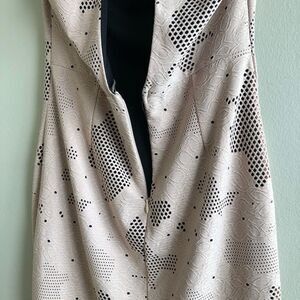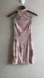 Mystic vintage sexy fitted high neck open back sleeveless bodycon mini dress with mesh floral overlay + fully lined. Button closure on back of neck. Cream / tan in colour with black liner. No size tag but likely a size XS / extra small. Approximate measurements | armpit to armpit: 14“ length: 32“ Great gently pre loved condition - small pink mark on back (pictured). No fabric and care tag attached: soft with light stretch. Offers welcome!