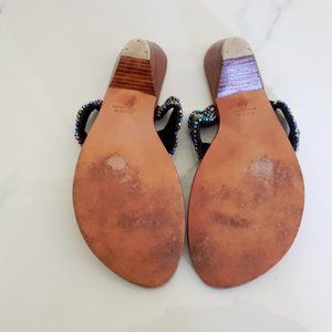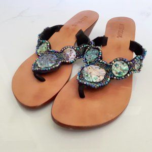 Mystique bead, sequin, natural shell disc embellished heeled flip flop sandals