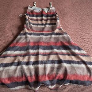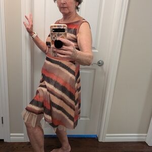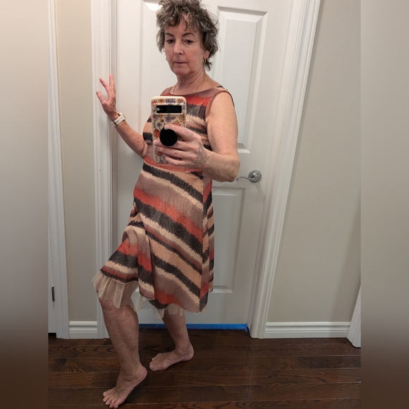 Sleeveless open-weave mini dress with soft and comfortable cream under slip with ruffled hem. Earthy stripes in tan, rust and brown. Half-zip back with button closure at nap. Flared A-line shape for easy, flowy and feminine movement. Casual yet polished for daytime wear. Summertime patio lunch is calling!