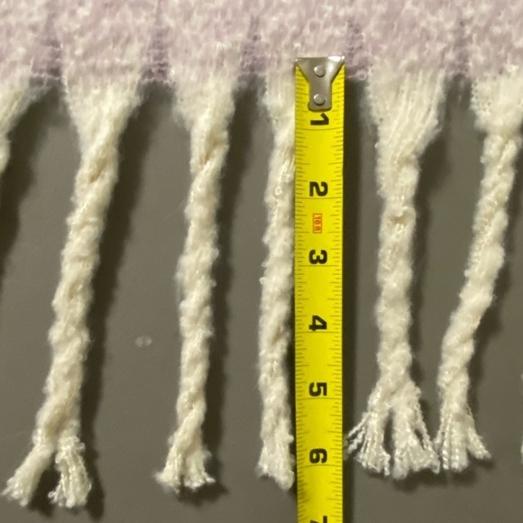 Approximate measurements taken laid flat are 17.5โ wide by 80โ long including the tassels. 68โ long excluding them.