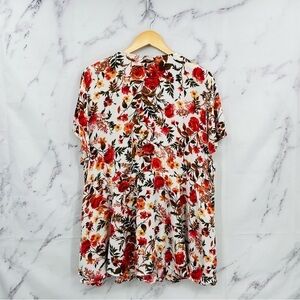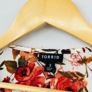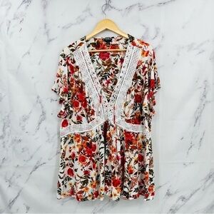 N028 Torrid Babydoll Crinkle Gauze Crochet Inset Lace-Up Top - Floral White