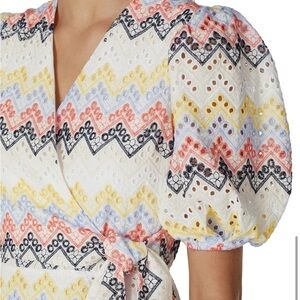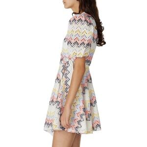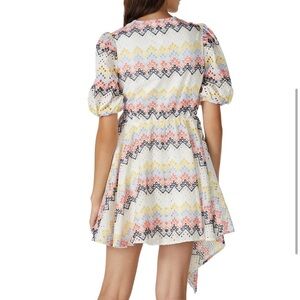 Playful and feminine, this Printed Alice mini dress by N12H features a vibrant multicolor zigzag pattern on airy eyelet cotton with a flirty asymmetrical skirt for a standout summer look.