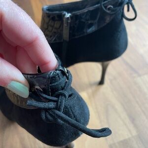 In good condition gently worn. Genuine suede made in Italy. Lace up details on the back. Side zipper. Pointy toe. Mix embossed fabric. Heel height: 4''. Made in Italy.