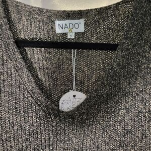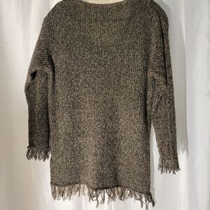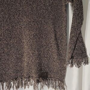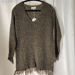 NADO brown knit sweater with fringe on sleeves and sweater bottom.