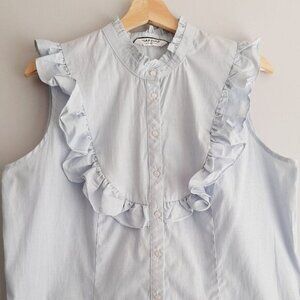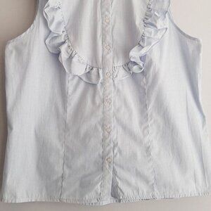 • Sleeveless button down shirt top in white and blue stripe pattern. Featuring ruffled neckline and bib detail.