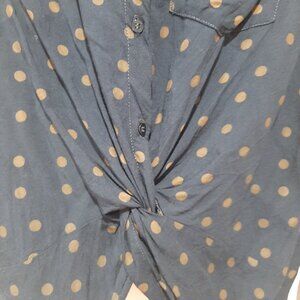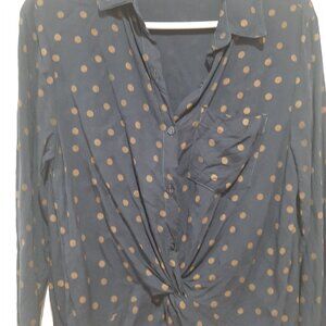 Navy button up blouse with a twist front detail that gives a flattering shape. The fabric is viscose and has a subtle linear texture to it and is lightweight. The tan polka dot details are so cute and on trend!