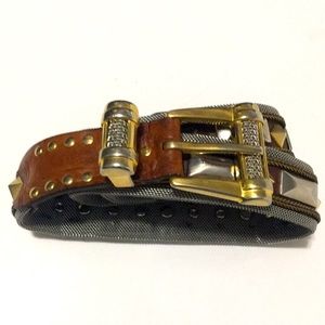 SILVER GOLD HARDWARE AND LEATHER UNISEX BELT feature on Elegant chrome silver and gold buckles design with a steel mash belt strap.