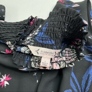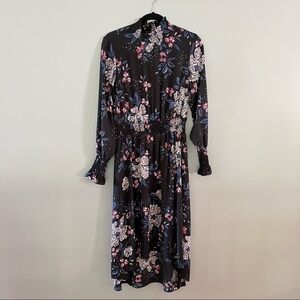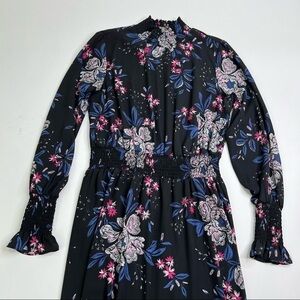 Nanette Lepore Black Mystic Blue Floral Smocked Mock Neck Chiffon High-Low Dress