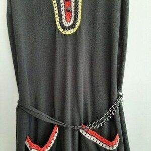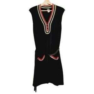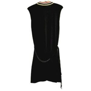 • Sleeveless fine knit sweater v-neck dress in black with crochet trim in red, tan and yellow. Featuring metal chain details alongside crochet trim and as a part of a belt. Two open front pockets and lightly padded shoulders.