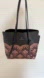 Nanette Lepore faux leather tote bag is a classic style with an open top. Double strap. Black with a tan, white and red floral design. Interior zipper pocket and another interior small pocket without a zipper.