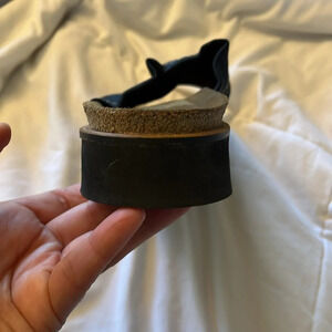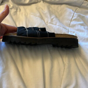 Jeans canvas stretch, comfort slides Sandals, genuine leather, molded heel cups and arches cradle your foot, absorb shock, may help with good posture, toe bar grips toes comfortably, durable cork insole, rubber soles made to last. These are vintage from 2004 collections in like new condition. Measurements are approximate.