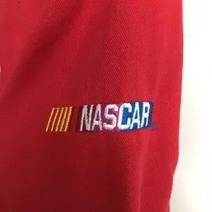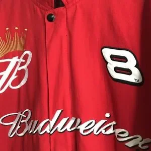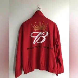 Bold red and black Winners Circle jacket with Budweiser Nascar branding. Features iconic logo and racing style.