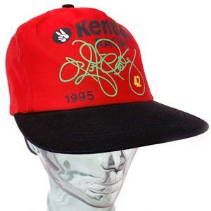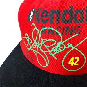 Officially licensed red and black Kendall Racing snapback cap from 1995 features logo printed on the front along with Kyle Petty’s signature and number. Made of 100% cotton, it features a flat bill with ability to curve, unstructured crown, embroidered eyelets and adjustable snapback closure for a custom fit. Condition is NEW, never worn.