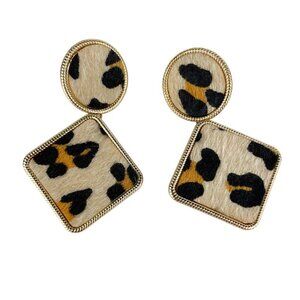I'm listening. The Caught My Attention Earrings feature a drop, geometric design, faux fur leopard detailing, and post back closures.