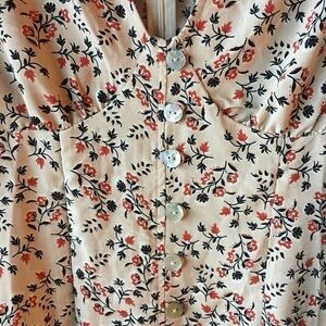 Small floral print dress with shell buttons. Zip in back. Pit to pit 17”. Length 32”