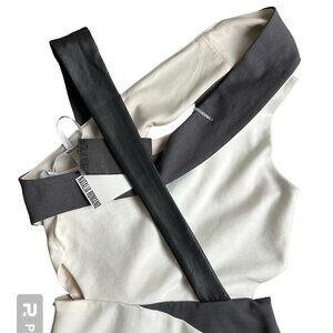 Natalia Romano Women's edgy contemporary cut out bodycon dress, is a stunning piece that exudes effortless elegance and modern sophistication. Made with a soft stretchy fabric, fully lined, this fitted dress features a side zipper as well as snap closure on bodice for easy wear. One shoulder design with criss cross strap detail in different colour ways and textures Side cut outs for a sleek and flattering design.