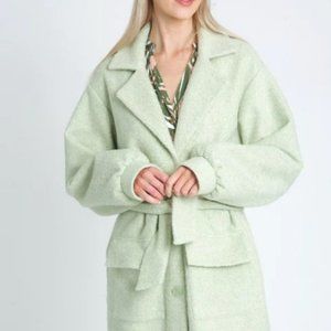 Introducing the Harmony Overcoat, coming in our signature color of the season, sage green. This winter warmer features a self-fabric belt tie, front patch pockets and puff sleeves, with a single-breasted finish. Combining dressing gown trends with AW runway style.
