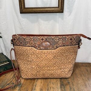 Beautiful cork handbag with laser-cut detailing and a colorful ornamental tile print on the top panel. Adjustable strap, zippered closure, and practical back pocket. Originally had two sewn handles that were removed — only faint stitching marks remain, barely visible. Unique and eco-friendly accessory.