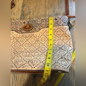 Beautiful cork handbag with laser-cut detailing and a colorful ornamental tile print on the top panel. Adjustable strap, zippered closure, and practical back pocket. Originally had two sewn handles that were removed — only faint stitching marks remain, barely visible. Unique and eco-friendly accessory.