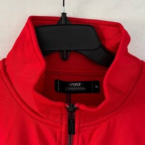 Size: X-Large. Color: Red. 100% polyester. Authentic Luxury Athletic Collection. Zipper closure. Two side zip pockets on front. Interior pouches. Raised Toronto Raptors logos on sleeves and upper left chest.