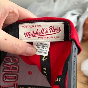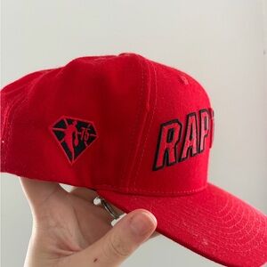 Vibrant red hat with bold black 'Raptors' text. Ideal for sports enthusiasts.