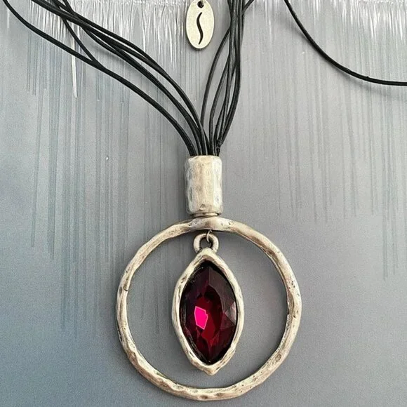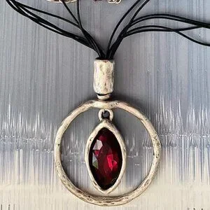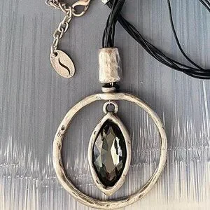 Necklace, features an oval beveled crystal set within a circular frame contrast. This pendant is suspended from a leather strap, combining the delicate beauty of crystal with the rugged charm of leather.